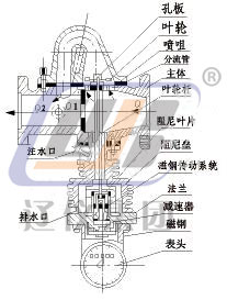 流量計是按節(jié)流元件,分流原理設(shè)計制造的;被測蒸汽進入流量計主體后分為兩路,一路Q1通過節(jié)流孔板(此部分蒸汽不作計量),在孔板兩側(cè)產(chǎn)生壓差△P,在此壓差作用下,另一路Q2流經(jīng)噴嘴噴射在葉輪上,葉輪軸轉(zhuǎn)動。為減慢葉輪軸轉(zhuǎn)速,葉輪軸下方按有阻尼葉片并浸沒在阻尼室內(nèi)水中。由于兩路有同一壓差△P,在規(guī)定流量范圍內(nèi),根據(jù)流體相似原理,兩路蒸汽流量Q1和Q2之間的比例關(guān)系基本為常量,這樣只要測出流經(jīng)噴嘴部分的流量Q2,即可知總流量Q。